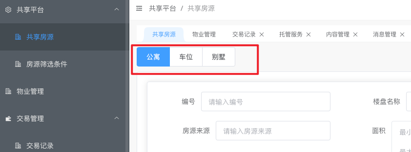 在 Web 管理员后台的「物业管理」和「共享房源」页面中,公寓、车位、别墅三种类型的页面切换时,也不要刷新数据,同上所述修改。